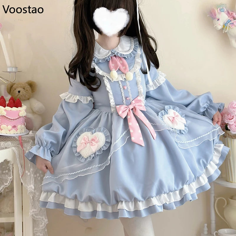 Kawaii Lolita Sweet Bow Ruffles Cartoon Bunny Long Sleeve Mini Dresses