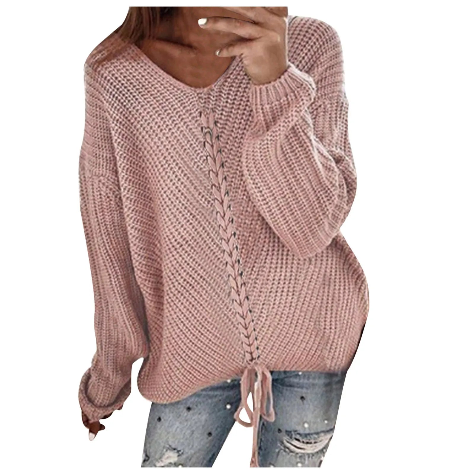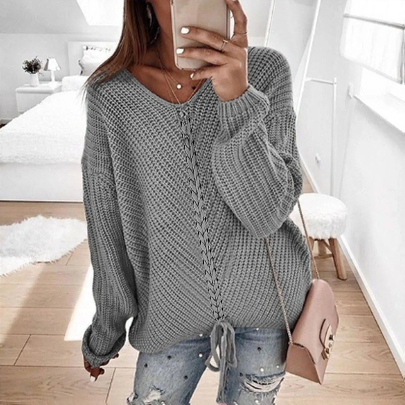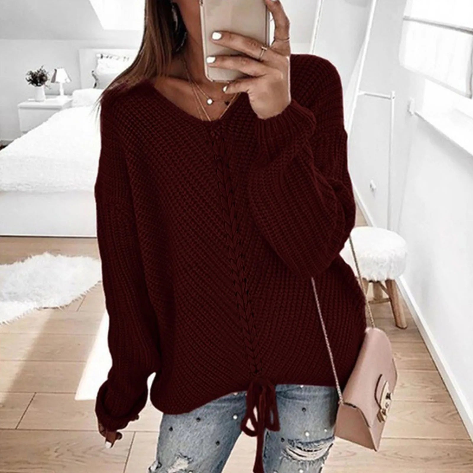 Women Oversize Lace Up V-Neck Knit Top sweater